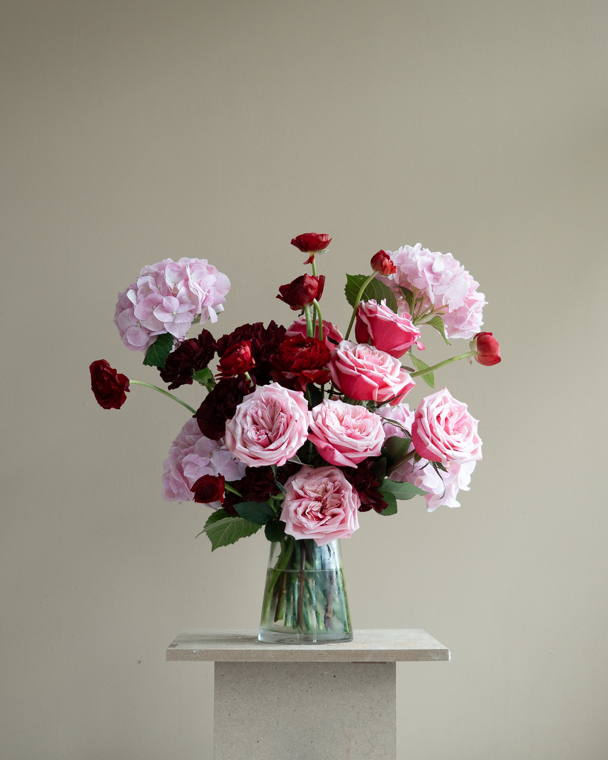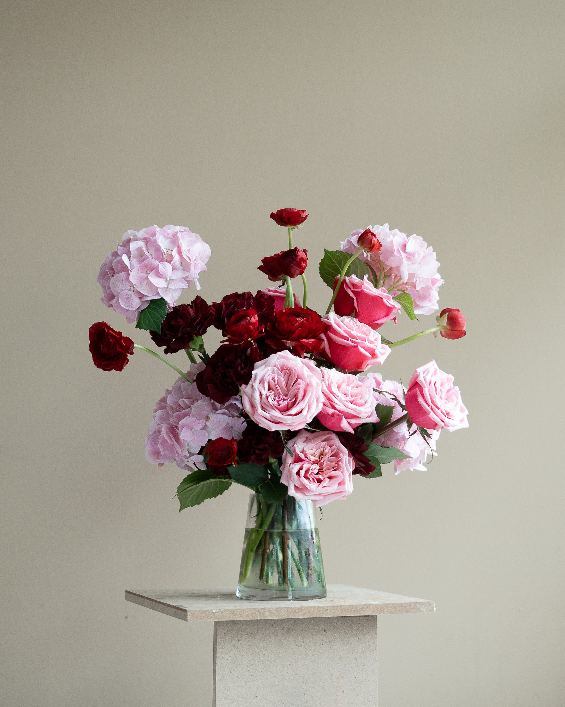 A blushing rouge arrangement featuring classic blooms in rich red and soft pink tones. Romantic and refined, it captures a quiet sense of passion with timeless appeal.