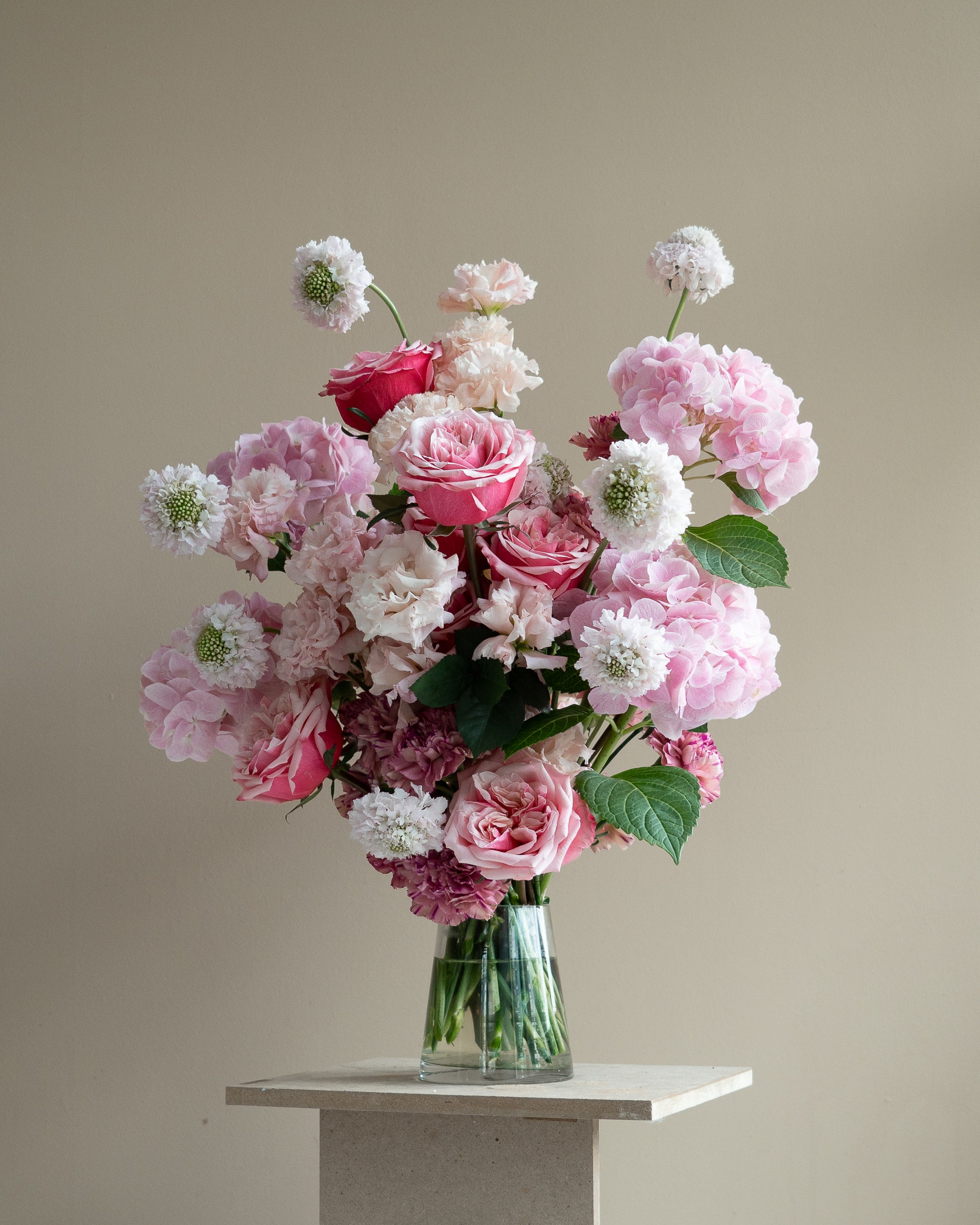A soft serve pink arrangement featuring classic feminine blooms like roses and hydrangeas. Sweet, romantic, and beautifully delicate — perfect for a girly, elegant touch.